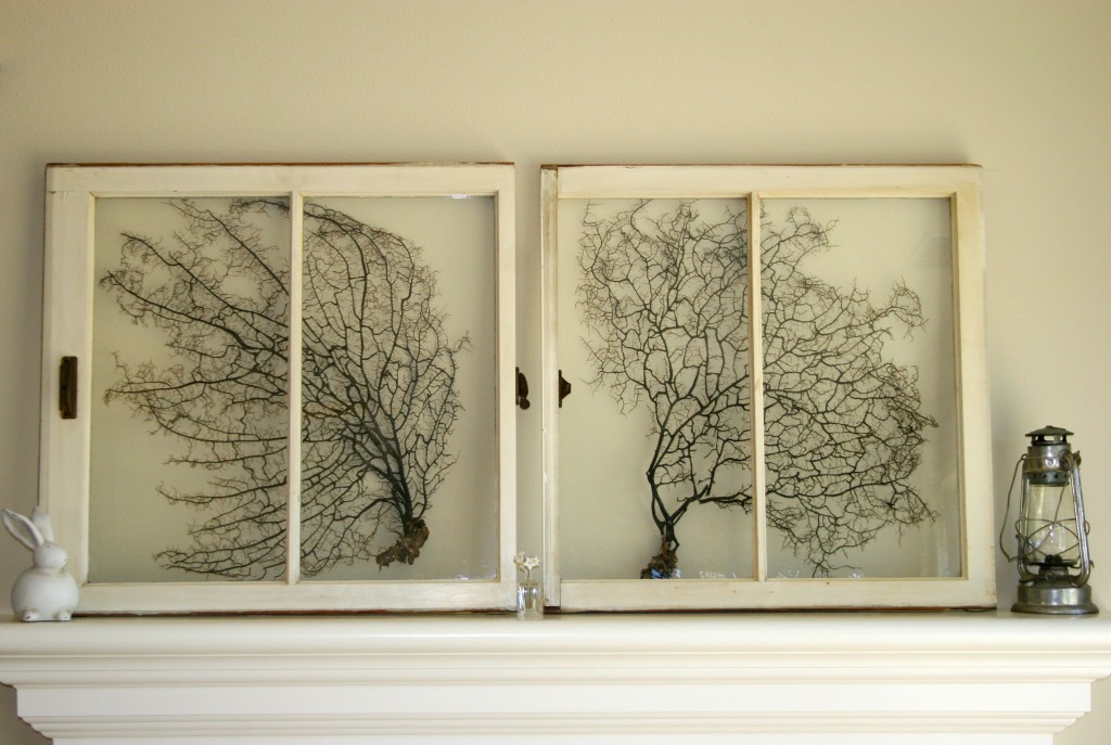 the spring mantle is on display! i just love these old wood windows i picked up for $5 each on craigslist. i bought the seafans online for about $18 each. some hot glue. voila! i’m loving the white on white. so clean, simple and soothing, imho. Happy Easter everyone! linked to: